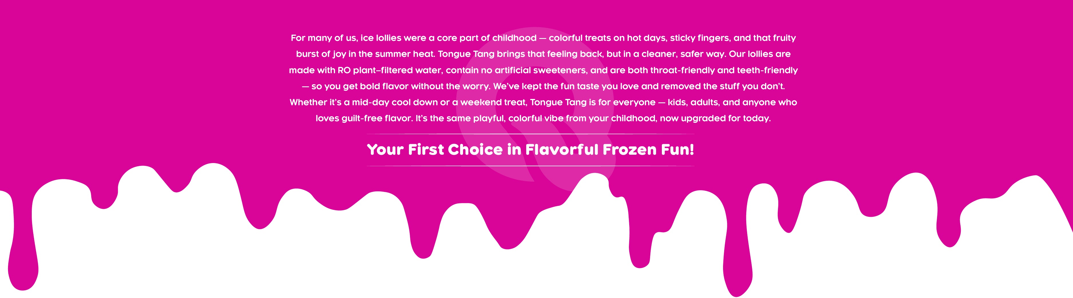 Tongue Tang is bringing the golden era of ice pops back—cleaner, safer, and tastier. With RO-filtered water, no artificial sweeteners, throat-friendly, teeth friendly, strict quality control, and diverse fruity flavors, we’re rewriting the story of frozen treats in Pakistan.
